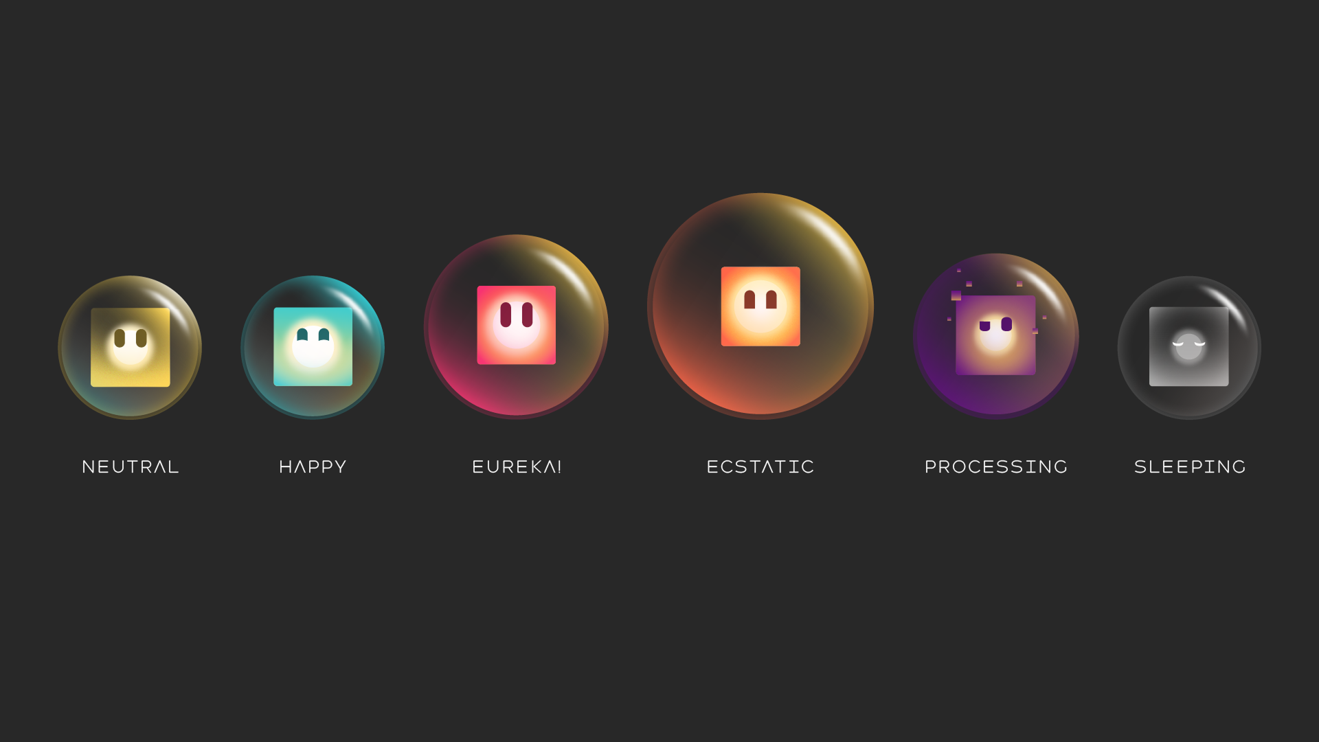 The solution came down to two layers: emotion was conveyed through the eyes and subtle surface details on each mascot state, while a shared floating animation tied all variants together as one unified brand. Each emotional state was mapped to a specific technical function, giving the mascots both character and purpose.